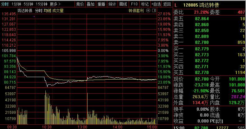 点击我的头像——组合,可以查看和购买我的实盘基金组合哦!可转债投资中,有个非常知名的策略叫“双低策略”【低价、低溢价率】,其中低价表示安全,低溢价率表示弹性大。昨天,双低策略中的鸿达转债(128085)开盘后飞流直下,很快触及-20%的熔断价位,半小时后再次开盘,最大下跌至-27.36%,临近第二档熔断价-30%!截至收盘,该转债已经是两市双低指标最低的转债!其他稍高点的还要齐翔转2、本钢...