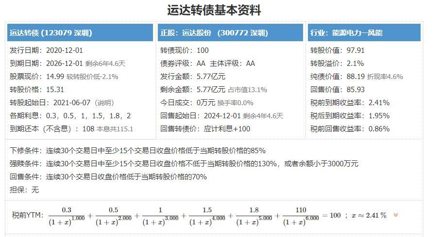 导语:12月1日,风电行业技术领军企业运达股份发行5.77亿运达转债,正股估值如何?申购预期收益如何?有没有抢权配售价值?运达转债发行12月1日,运达股份公开发行5.77亿元可转换公司债券,简称为“运达转债”,债券代码为“123079"。当前正股价:14.99元,转股价:15.31元,转股价值:97.91元,纯债价值:87.49元,保本价:115.1元,债券年收益:2.41%,AA级。发...