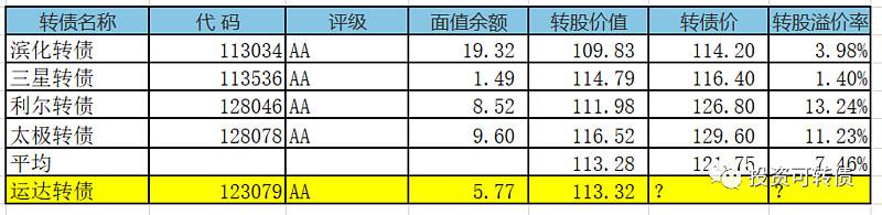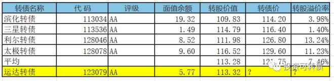 12月25日,运达转债上市,当前正股价:17.35元,转股价:15.31元,转股价值:113.32元,纯债价值:87.75元,保本价:115.1元,债券年收益:2.44%,AA级。发行规模5.77亿。公司简介浙江运达风电股份有限公司是国内较早从事大型风力发电机组研究与制造的企业,是中国风电发展史的拓荒者和创新者,前身是浙江省机电设计研究院风能研究所,2001年浙江运达风力发电工程有限公司组建成立,...