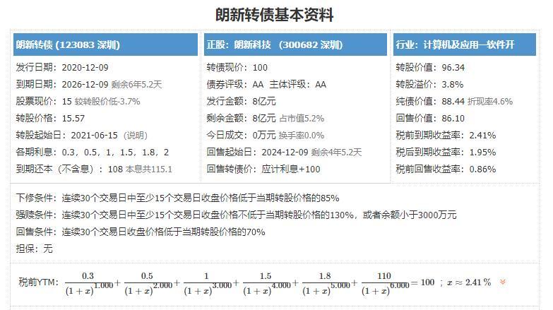 朗新转债,申购代码370682,交易代码123083。整体评价:黄金级,内在价值112.1元,按当前情况预计每签可以盈利160元。基本信息:AA,6年期,转股溢价3.8%,每张持有到期本息为115.1元(税后本息为112.08元)。发行规模8亿元,每股配售0.7833元,最低128股可确保中一张,股权登记日为12月8日。正股朗新科技(300682),信息技术行业,公司集中于电力信息化行业...