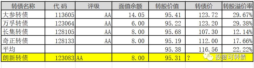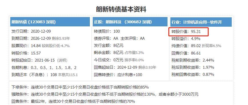 转债上市朗新转债123083朗新科技300682,规模:8亿,2021-01-06上市转股价格15.57元,当前价格14.84元,转股价值95.31,评级:AA主营业务:产业互联网业务,包括基础服务领域、产业通用赋能概念:智能电网、云计算、国产软件、区块链、工业互联*行业很好,股价相对低位,转股价值低***转股价值95.3元,假设溢价率8~12%,转债合理价格103~107元威唐转...