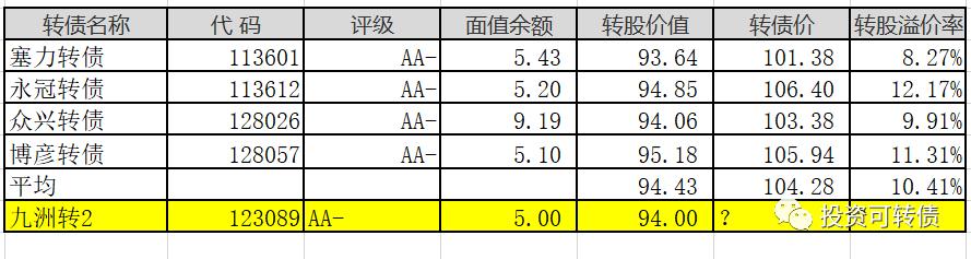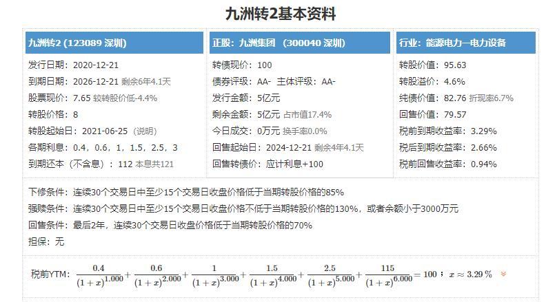 九洲转2,申购代码370040,交易代码123089。整体评价:质地一般,内在价值112.8元,按当前情况预计每签可以盈利150元。基本信息:AA-,6年期,转股溢价4.58%,每张持有到期本息为121元(税后本息为116.8元)。发行规模5亿元,每股配售1.3144元,最低77股可配售一张,股权登记日为12月18日。正股九洲集团(300040),电气设备,公司主营提供智能配电网相关产品和...