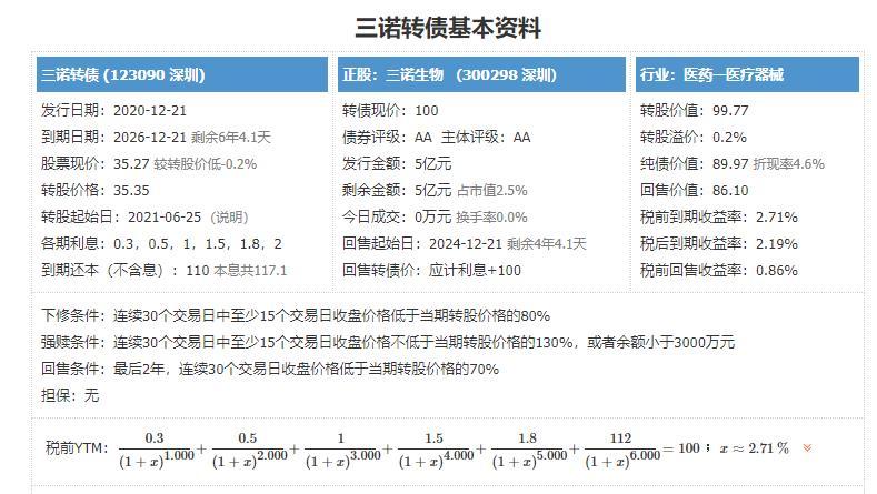 导语:血糖仪龙头三诺生物发行5亿元三诺转债,正股估值和可转债价值如何?12月21日,三诺生物公开发行5亿元可转换公司债券,简称为“三诺转债”,债券代码为“123090"。当前正股价:35.27元,转股价:35.35元,转股价值:99.77元,纯债价值:89元,保本价:117.1元,债券年收益:2.71%,AA级。发行条款利息和赎回价:第一年0.30%、第二年0.50%、第三年1.00%、...
