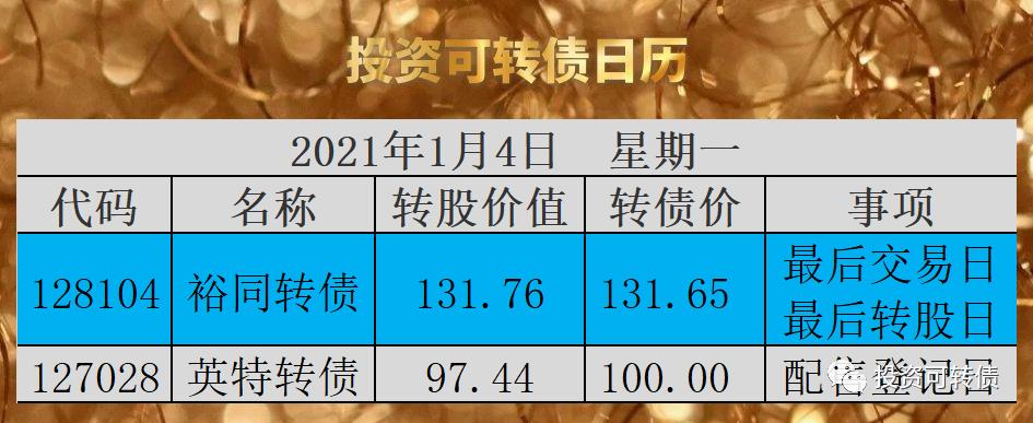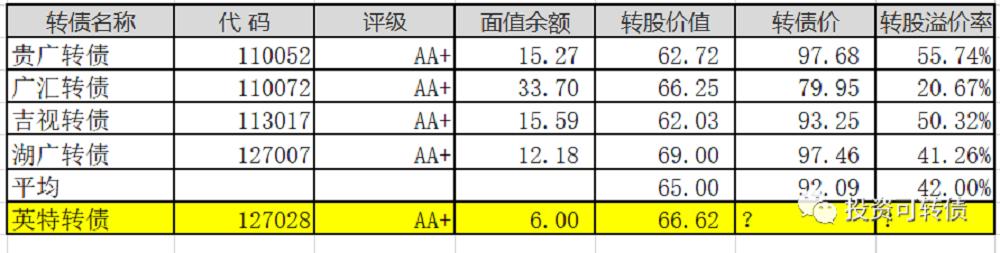 欢迎在天天基金app首页搜索和购买我的基金组合“雄霸天下”或“绝对赚钱”。英特转债,申购代码070411,交易代码127028。整体评价:类黄金级,内在价值111.7元,按当前情况预计每签可以盈利110元。基本信息:AA+,6年期,转股溢价率2.63%,每张持有到期本息为113.1元(税后本息为110.48元)。发行规模6亿元,每股配售2.4102元,最低42股可配售一张,股权登记日为1月4...
