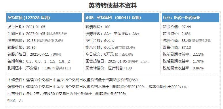 3月10日,英特转债上市,当前正股价:13.25元,转股价:19.89元,转股价值:66.62元,纯债价值:88.85元,保本价:113.1元,债券年收益:2.17%,AA+级。发行规模6亿。公司简介公司为区域性医药流通重点企业,以经营药品、中药、生物器械为主营业务,以医药专业分销、现代物流、电子商务、生产加工及终端零售为主要经营业态,下属包括浙江英特药业有限责任公司、浙江英特医药药材有限公司、浙...