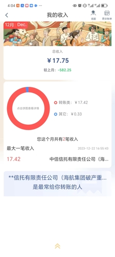 弟兄们,我5万多剩余债券权益,12月22日海航给我打了17.75元,你没看错!