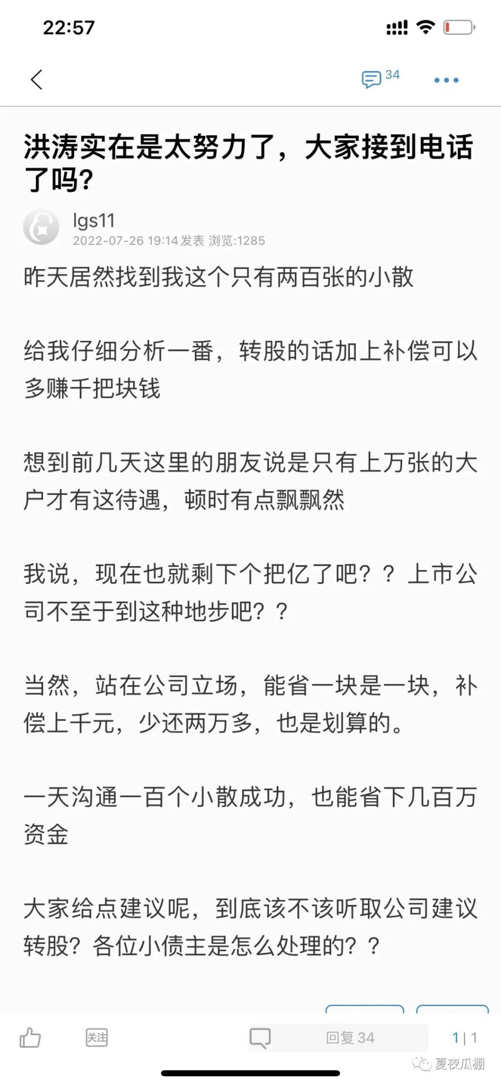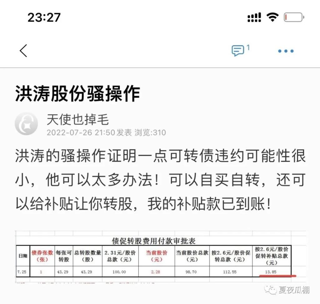今天手机版,说说今天看到的一个奇葩事。上市公司洪涛股份为了不还自己发行的到期的洪涛转债,来了一把骚操作。本来洪涛转债因为到期没达到强赎标准,股价也没达到转股价,是只有欠债还钱一条路的。但洪涛股份今天秀了一把骚操作,那就是给每个持有人打电话,承诺补偿转股价和现价之间的差价,让转债持有人把可转债溢价转股,拿去在市场卖掉。这样转债持有人能赚到比单纯债券更多的钱,而公司也不必还债,可以说是双赢。我...
