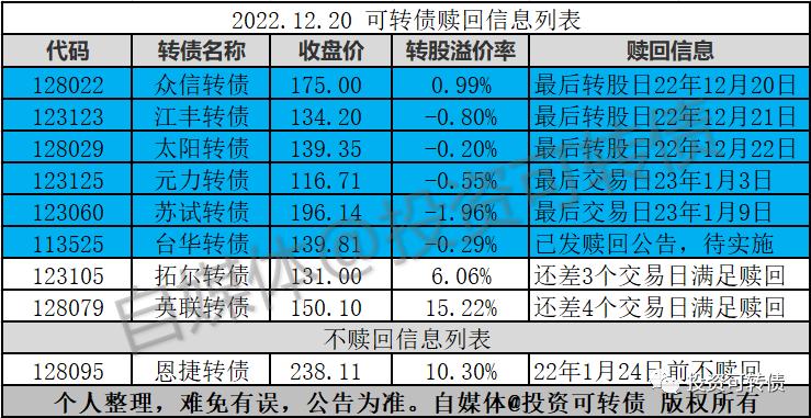 众信转债、江丰转债、太阳转债已经停止交易,最后转股日分别为20日、21日、22日。如果持有的投资者忘记转股操作将亏损24%~42%不等。当前有赎回相关信息的可转债列表见下。对于已经实施赎回的可转债,投资者应注意在最后交易日之前卖出或赎回登记日之前转股,避免被低价赎回导致亏损。注:表中列出所有已经宣布赎回转债,新增不赎回消息转债,近期不赎回转债,不包含远期不赎回转债。标黄部分为新赎回消息转债。赎回影...