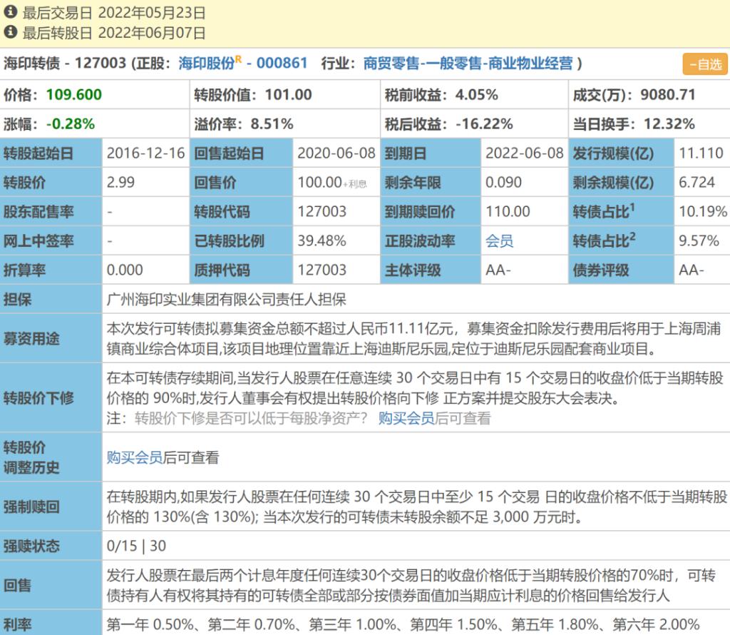 即将到期的海印转债和洪涛转债,最近比较受关注,因为不少人是120左右买入博弈强赎的,结果却等来了到期赎回,对于已经持有的伙伴来说,要不要卖出他们呢?今天我们一起来分析下吧。海印转债公司简介:广东海印永业(集团)股份有限公司于1998年在深交所挂牌上市,公司总股本4.9亿股。截至2009年9月15日,公司市值逾49亿人民币。公司主营业务包括主题商场及综合性商业物业开发租赁、高岭土、炭黑三大领域。...