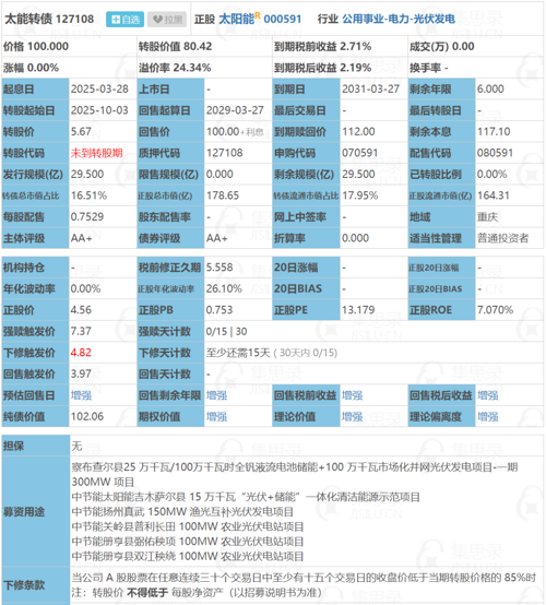 太阳转债:(正股代码:000591,配债代码:080591)评级:AA+评级,可转债评级越高越好。发行规模:29.5亿,规模较大,可转债规模越大流动性越好。回售条款:有下调转股价:15/30,85%,条件较严苛。转股价值:太阳能今日收盘价4.56,转股价5.67,转股价值=转债面值/转股价*正股价=100/5.67*4.56=80.42,转股价值低,可转债转股价值越高越好。到期价值(保本线):到...