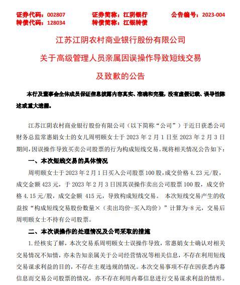 2月7日,江阴银行(002807)发布《关于高级管理人员亲属因误操作导致短线交易及致歉的公告》表示,该行财务总监常惠娟之女周明颐于2023年2月1日至2023年2月3日期间,因误操作导致买卖公司股票的行为构成短线交易。公告显示,周明颐于2023年2月1日买入该行股票100股,成交价格4.23元/股,成交金额423元,于2023年2月3日因其误操作卖出该行股票100股,成交价格4.15元/股...