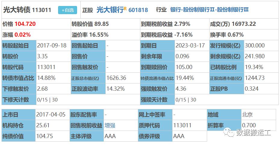 关于光大银行转债的未来,我在22年12月29日就说到了这个问题,文章链接:2022已是过去;2023静等花开。一、光大转债的一生:1.它的一生,可以用两个字来概括:孤寂2.历史最低价99.8元,也就是破发;历史最高价133.02元,只有3天突破了130元,17年后所有退市转债中,最高价低于135元的转债,只有光大,且其一生,没有太大波澜,几乎刚出生就处于躺平状态,跟现在很多人是一样的,不进取、不学...
