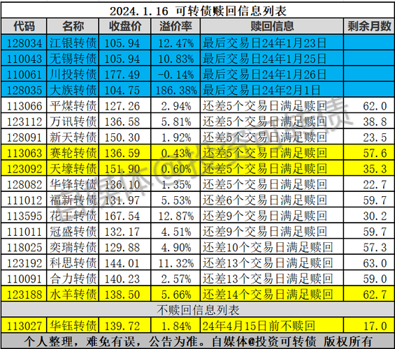 原文发送于昨日晚间。江银转债即将到期赎回,溢价率高达12.47%。江南水务持有5.6亿元江银转债,占转债发行量的28%。江南水务或许是为了支持江阴银行的补充准备金的要求,全部溢价转为江阴银行股票,这与光大转债到期前出现溢价转股如出一辙。赛轮转债、天壕转债正式发布可能满足赎回条件提示性公告,都还差5个交易日满足赎回条件。水羊转债正股高于赎回条件价,加入赎回列表,还差14个交易日满足赎回条件。华钰转债...
