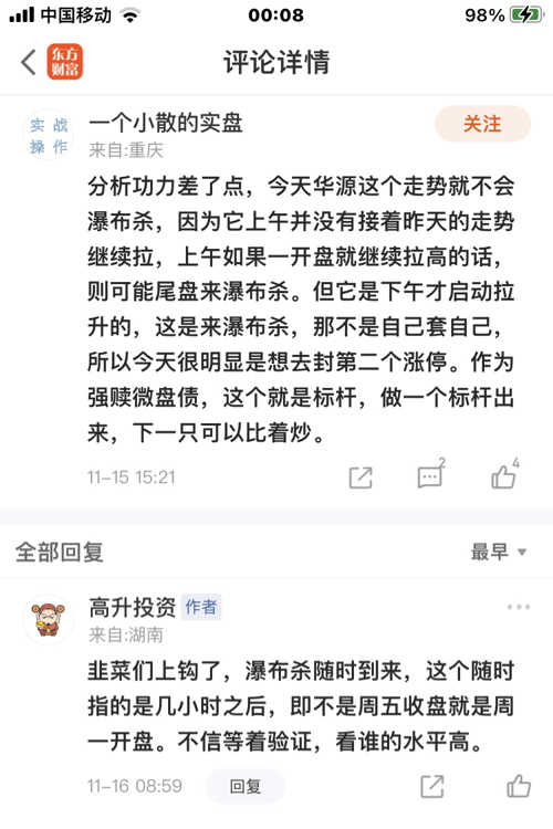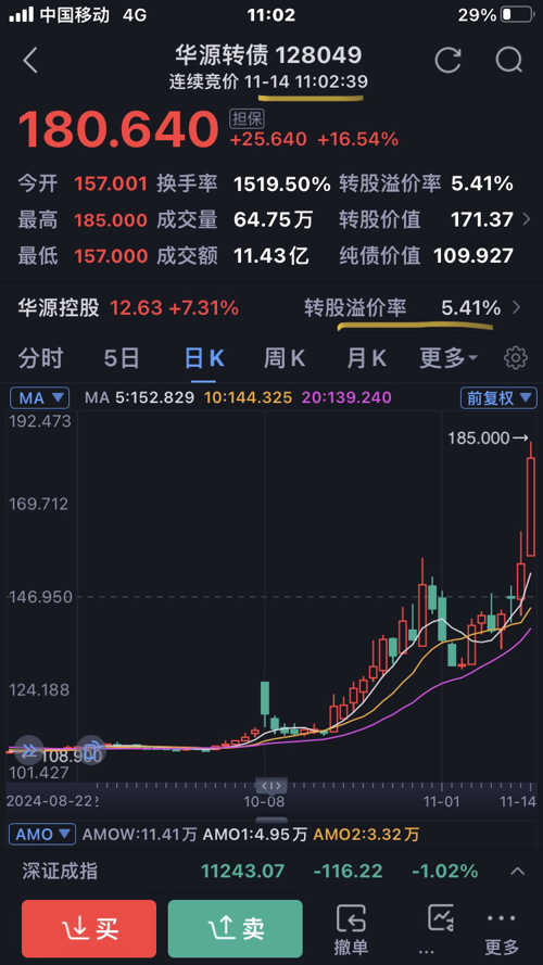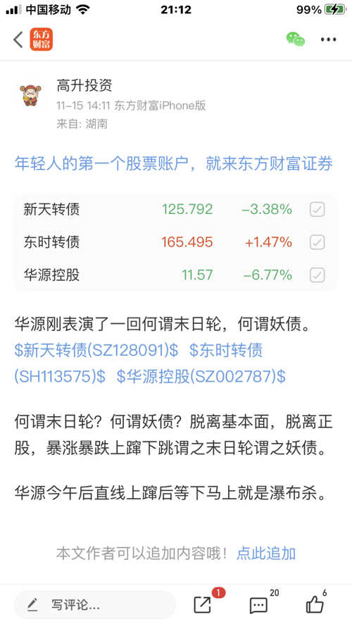 华源刚表演了一回何谓末日轮,何谓妖债。$新天转债(SZ128091)$$东时转债(SH113575)$$华源控股(SZ002787)$何谓末日轮?何谓妖债?脱离基本面,脱离正股,暴涨暴跌上蹿下跳谓之末日轮谓之妖债。华源今午后直线上蹿后等下马上就是瀑布杀。