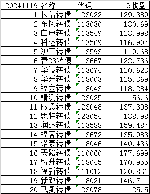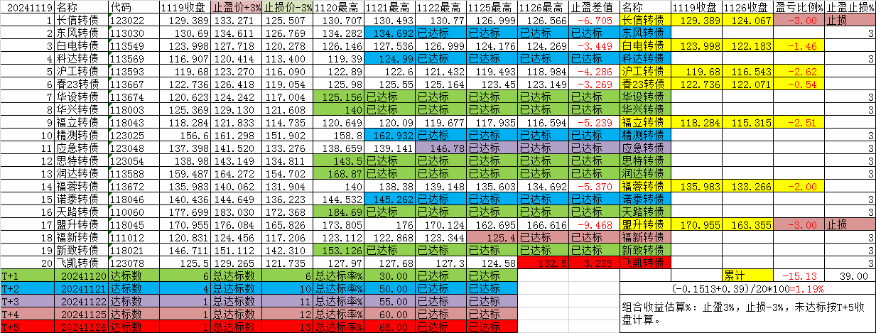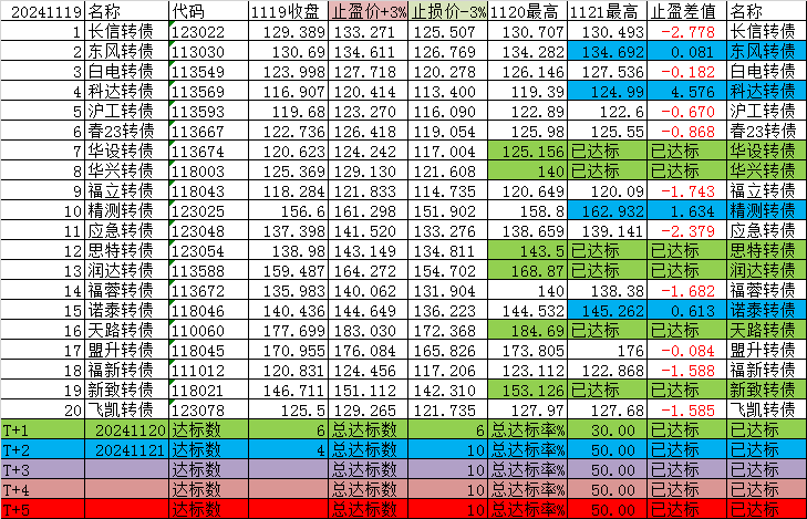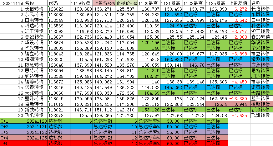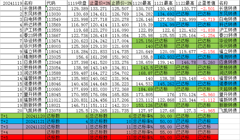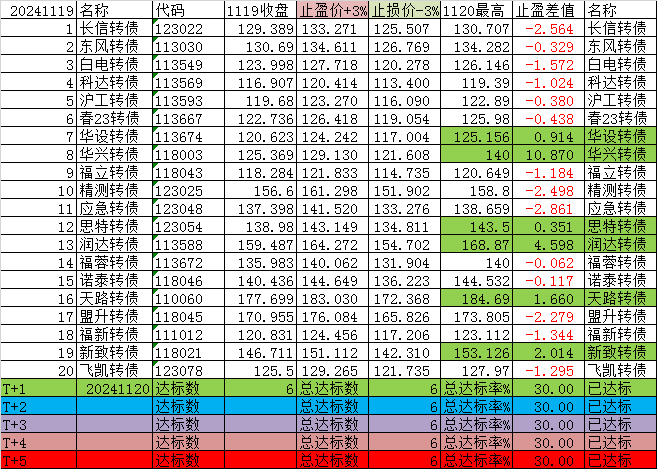尾盘可转债(短线),即每日尾盘14:40后,通过选债选择一批可转债标的,考察标的一周内大于3%收益的概率(五个交易日,以最高价计算)。盘中采用其他方式公布,本栏目不便及时发帖。为了计算方便,盘后以当日收盘价作为计算初始数据。选债标的见文后表格,仅供研究参考,以此投资风险自负!各处栏目号均以黄金阶梯转债宝为名,其他名字非本栏目发布。#“中国英伟达”摩尔线程开启IPO之路##日出东方12天11板,行情逻辑是什么?#...