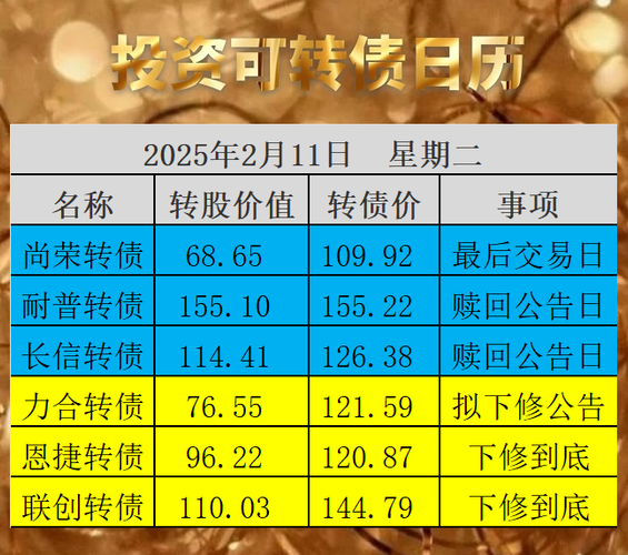 原文发送于昨日晚间。11日为尚荣转债最后交易日,转股价值低至69元,税后赎回价为109.6元,比较而言,现价卖出划算。耐普转债满足赎回条件,公司宣布强赎,利空转债,详见赎回信息列表。长信转债即将到期,公司宣布到期赎回,利空转债,详见赎回信息列表。力合转债满足下修条件,公司提出下修议案,利好转债,详见下修信息列表。恩捷转债下修议案获得通过。公司宣布转股价下修到32元,稍高于最低下修价30.34元,下...