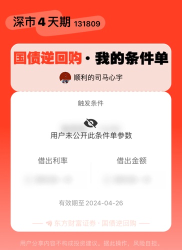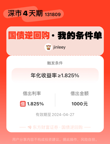 #条件单交流##国债逆回购晒单#一位股神设置了一个国债逆回购条件单,接下来就是见证奇迹的时刻~$R-004(SZ131809)$