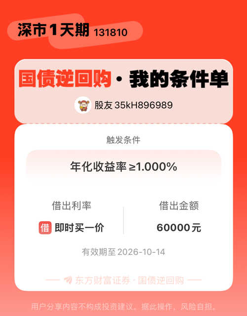 #条件单交流##国债逆回购晒单#一位股神设置了一个国债逆回购条件单,接下来就是见证奇迹的时刻~$R-001(SZ131810)$