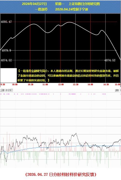 【一路涨停金融研究】2026.04.27上证指数日分时何时何价研究反馈 今天大盘如预期呈M型震荡,高点仅相差2.64(4095.47-4092.83),低点仅相差3.44(4074.52-4071.08),整体振幅不大。预期明天振幅加大,有明显的方向性选择,且看2026.04.28日分时何时何价研究,一见分晓。 研究图中的空间价格可能存在比较大的差异,仅供参考。