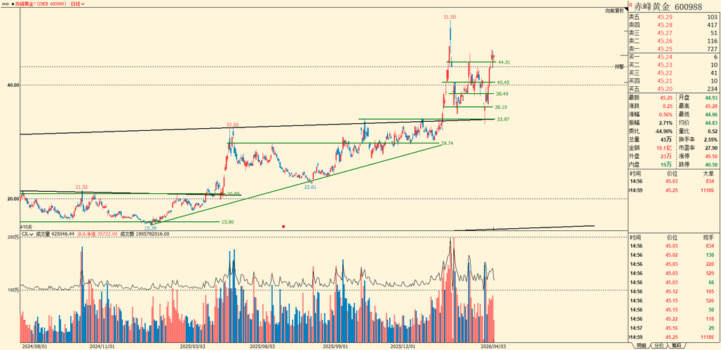 $赤峰黄金(SH600988)$ 今日价格继续在44的支撑位之上震荡, 继续保持之前观点,仙人指路, 盈亏比划算