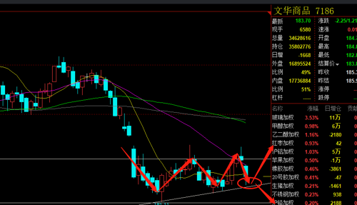 指数直接大幅度的下跌,多头大幅度的减仓,盘中一度下跌到3个点,从日线图形中就可以明显的看出来,现在行情是直接跌倒了前期双底的底部,昨天我在文章中提到过,行情可能会再回调2个交易日,今天就直接打下来了,按照周期来看,不排除还有一个低点的可能。按照形态来看,现在182不能跌破,如果跌破了就会去看到181,没有跌破的话就会在这里震荡,走出三重底的形态。今日国际原油大幅度的下跌对于盘面的情绪肯定是有影响的...