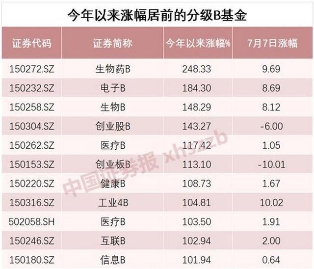近期A股牛市氛围浓厚,具有杠杆属性的分级B基金近期频频掀起涨停潮,不少投资者利用分级B基金来扩大收益。需要特别注意的是,分级B基金并不适合所有投资者。分级B基金存在杠杆效应,大部分分级B基金成交不活跃,且不少分级B基金存在较大溢价。业内人士提示,目前不少分级基金已依照相关规定转型清盘,投资者不可因为短期涨幅较大而盲目参与。分级B基金今年最高涨248.33%7月7日,涨幅超过9%的分级B基金有...