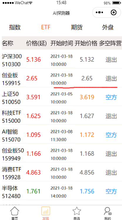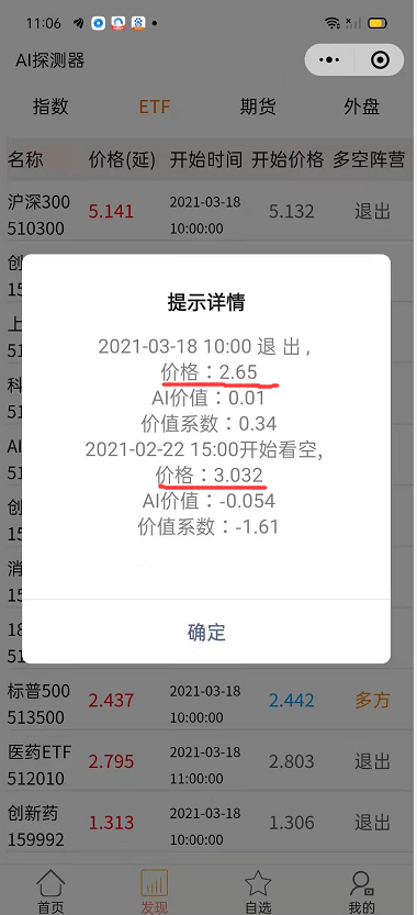 3月18日智盈盈提示:创业板ETF1599153月18日10:00提示退出空方阵营价格2.65,2月22日15:00提示进入空方阵营价格3.032。如果及时发现该ETF的风险,即可避免12.6%的损失。