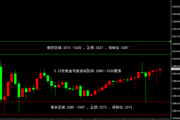 5月23日可能运行区间 伦敦金可能波动区间:3280--3320震荡 做多区域:3280-3287,止损:3273,目标位:3313 做空区域:3313-3320,止损:3327,目标位:3287 5月22日伦敦金复盘 预测区间3305-3345,实际走势3297-3345,高点完全相同,低点相差8个点