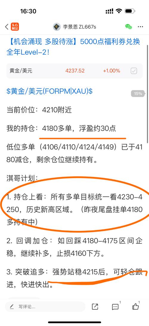 $黄金/美元(FORPM|XAU)$ 黄金多单完美收割,新计划已部署! 第一部分:落袋为安 4180/4210布局的多单,已于4230目标位减仓离场,利润稳稳入袋。 第二部分:再次进场 不追高,等回调!新的操作计划如下: 计划:回落至4220附近企稳后,接回多单。 防守:4210下方 目标:4240-4250 节奏分明,进退有据,把握下一段利润 $黄金ETF(SZ159934)$
