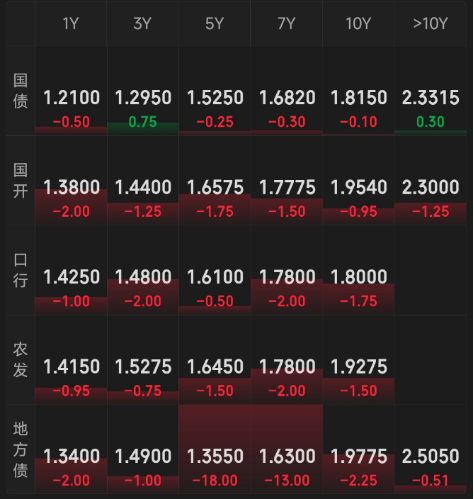 关注小谈,每天为你带来债市收盘行情及产蛋预估~市场复盘:债市今天震荡偏暖,各品种债券涨跌不一。目前十年期国债活跃券收益率小幅下行,利率债大面积翻红,短端涨幅明显,30Y继续上行。国债期货多数下跌,信用债和存单则是持续释放暖意。期限利差变化不大。资金面上,公开市场延续净回笼。今天逆回购到期规模为2240亿元,央行小额投放5亿元,流动性净回笼2235亿元,好在盘中资金面延续宽松,重要资金价格维持在低位...