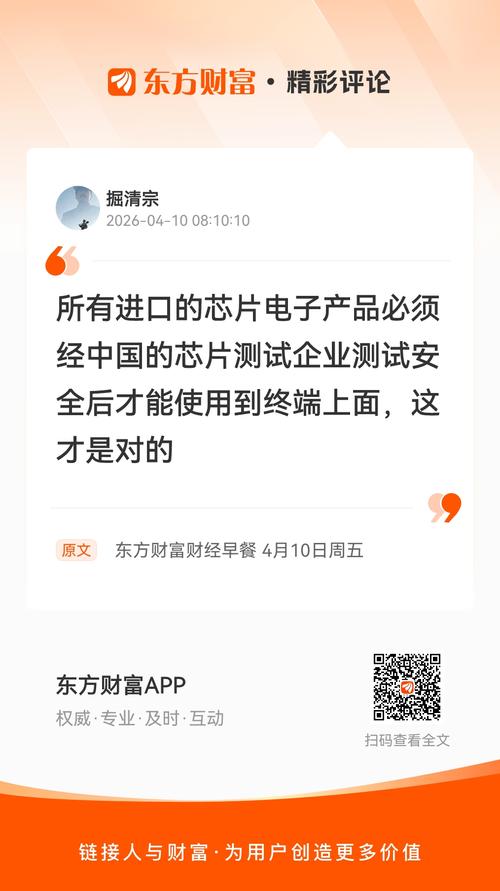 所有进口的芯片电子产品必须经中国的芯片测试企业测试安全后才能使用到终端上面,这才是对的 我在《东方财富财经早餐4月10日周五》的评论获得了大家的关注。