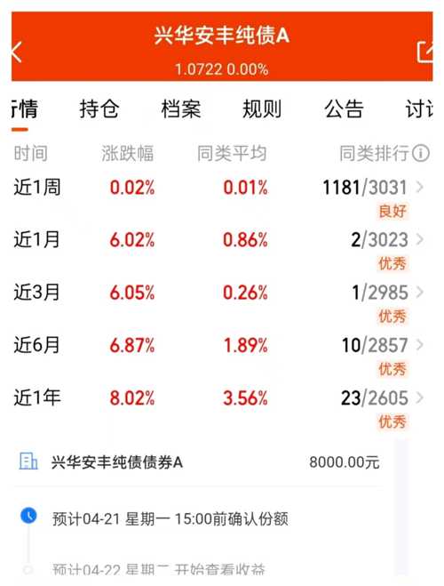 理财就求一个稳字,兴华安丰纯债债券A完美契合。它凭借中短债策略,在市场波动中闲庭信步。近一年收益超8%,各阶段收益在同类中名列前茅,连续三年正收益,是中长线投资的理想选择,帮你轻松实现财富梦想。 $兴华安丰纯债A$
