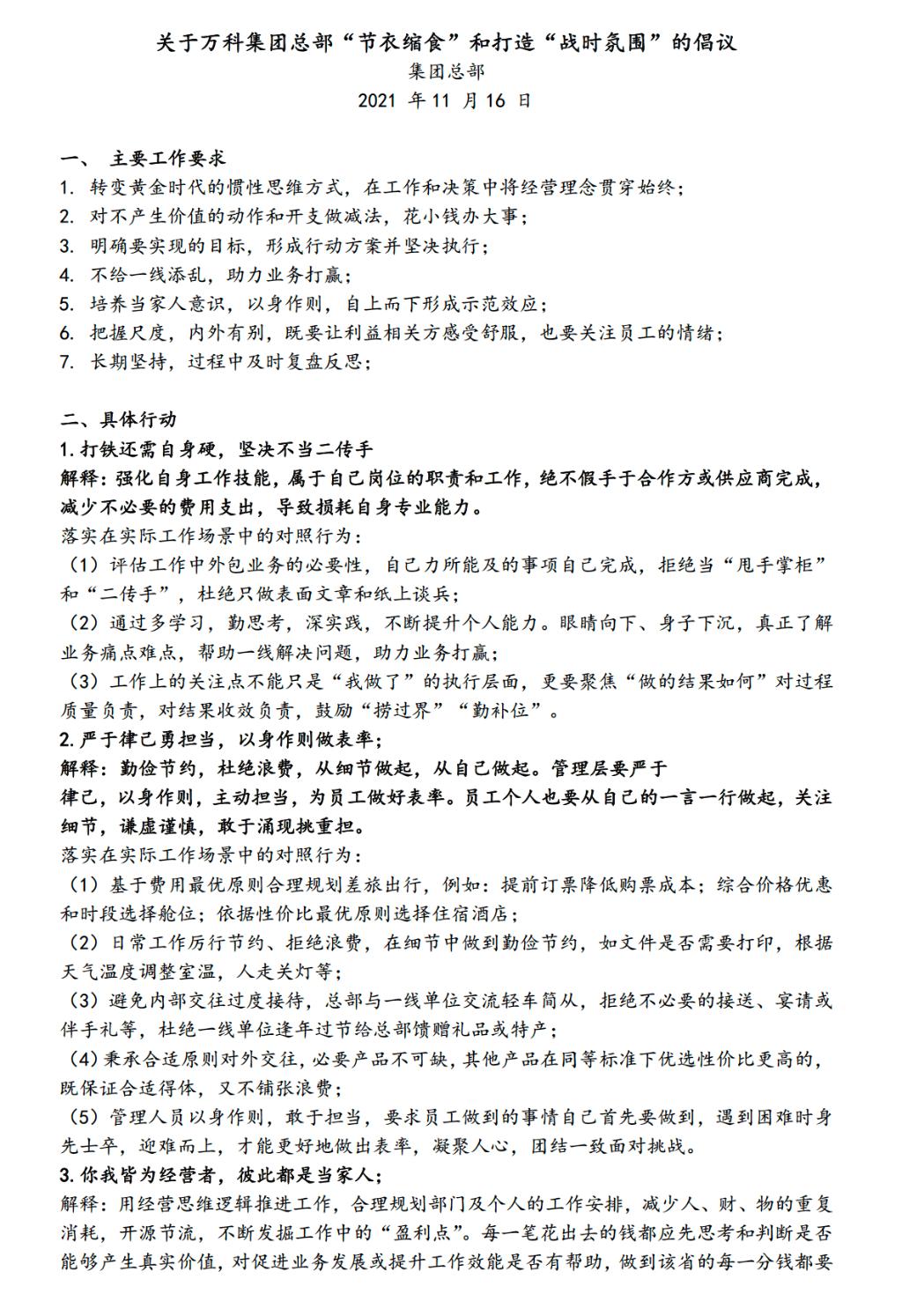 万科内部发文:倡议节衣缩食过冬,要花小钱办大事