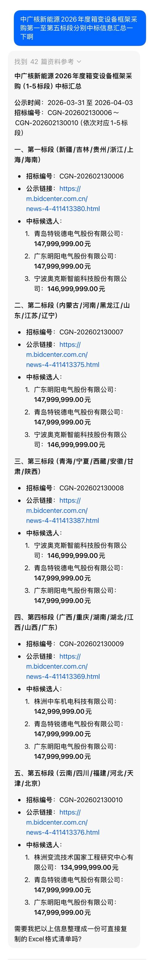 $特锐德(SZ300001)$【中标信息】中广核新能源2026年度箱变设备框架采购第一至第五标段预计中标2.5亿元左右!