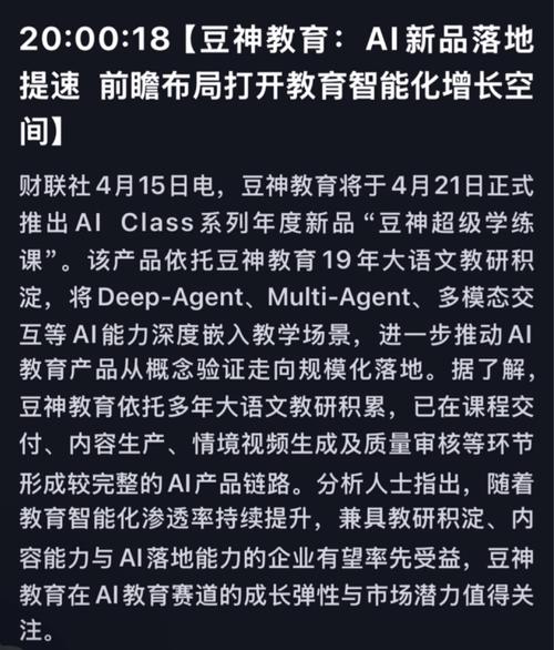 格隆汇4月15日|豆神教育将于4月21日正式推出AIClass系列年度新品“豆神超级学练课”。该产品依托豆神教育19年大语文教研积淀,将Deep-Agent、Multi-Agent、多模态交互等AI能力深度嵌入教学场景,进一步推动AI教育产品从概念验证走向规模化落地。据了解,豆神教育依托多年大语文教研积累,已在课程交付、内容生产、情境视频生成及质量审核等环节形成较完整的AI产品链路。分析人士指出,...