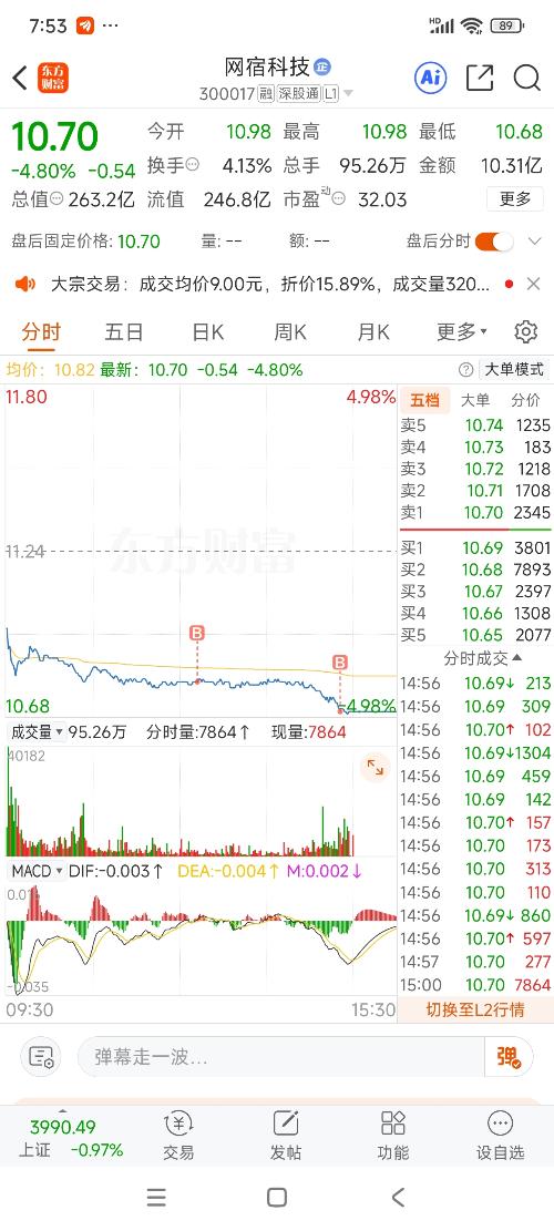 $网宿科技(SZ300017)$昨天320万股大宗交易,同一个营业部里交易,而持有超过320万股机构就没几家,不大可能是个人投资人在走这么大折价的大宗交易吧,机构想吓谁
