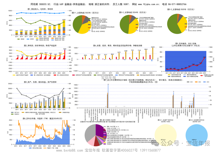 $同花顺(SZ300033)$ 同花顺(3000332025年报,下图列示公司2015-2025年的业绩变化。 主营业务:互联网金融信息服务。 2025年度营业收入60亿元,2021年35亿元,近五年营收共增长71%; 2025年净利润32亿,扣非净利润30.5亿,2021年净利润19亿,近五年净利润共增长63%; 2025年毛利率91.5%,净利率53%; 2025年股东权益95亿,负债63亿,...