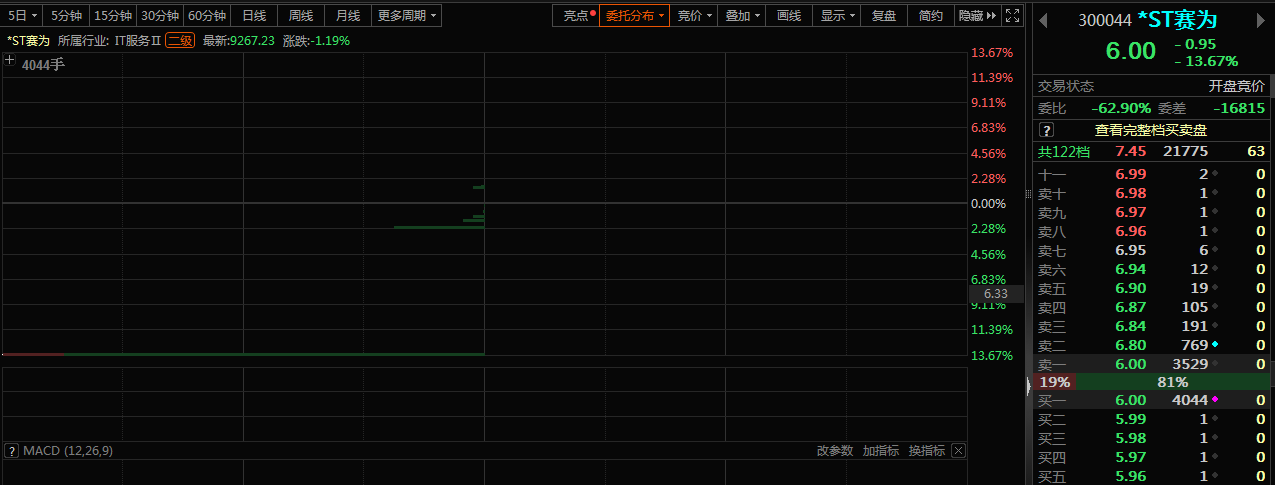 $*ST赛为(SZ300044)$A股唯一一个每天跌幅都能超5000股的股票。在A股只有赛便一只。