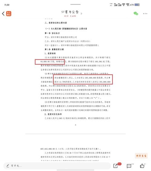 $ST赛为(SZ300044)$我司看赛为智能:战投协议签署解读补充说明 再次研读一下周末的战投协议(非投资方案),我司的解读说明有一些不足之处作如下补充: 1.关于神秘财务投资人的认购价格,公告中并未确认为3元/股,那么这个价格是有浮动空间的,可能会高于招平的认购价。但我们反向思考,同样是财投为何两种定价?我司认为一种理解方式为第一批财投是“招平系”,认购价3元。第二批,按惯例上浮10-30%是...