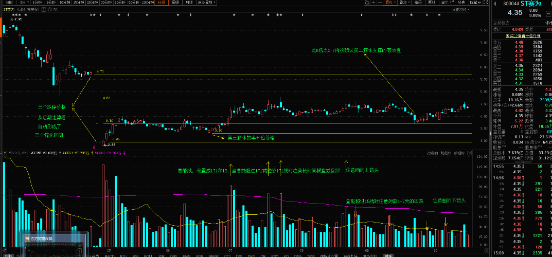 简单的画了一下赛为日级别箱体,此为在无重大消息面干扰下的平常走势。再画了一下量能线171和15线,对于短线客操作上来说:价格在箱体上沿相对高位时注意放量过了171线时的减仓,价格在箱体下沿相对低位时注意量能过15线的少许加仓