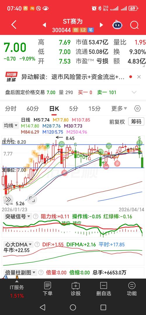 $ST赛为(SZ300044)$ ST赛为(300044)三阶段走势全景预判(4.14现价:7.00元) 风险提示:以下仅盘面+公告逻辑推演,不构成投资建议,ST退市风险极大 一、短期(4.15—4.21年报前:下跌主周期) 走势大概率:继续阴跌+放量杀跌,筑底6.0~6.5区间 1.4.21铁定出**-6.2~-8.7亿净资产,直接变*ST退市风险警示**,资金恐慌提前出逃是主线 2.之前重整协...