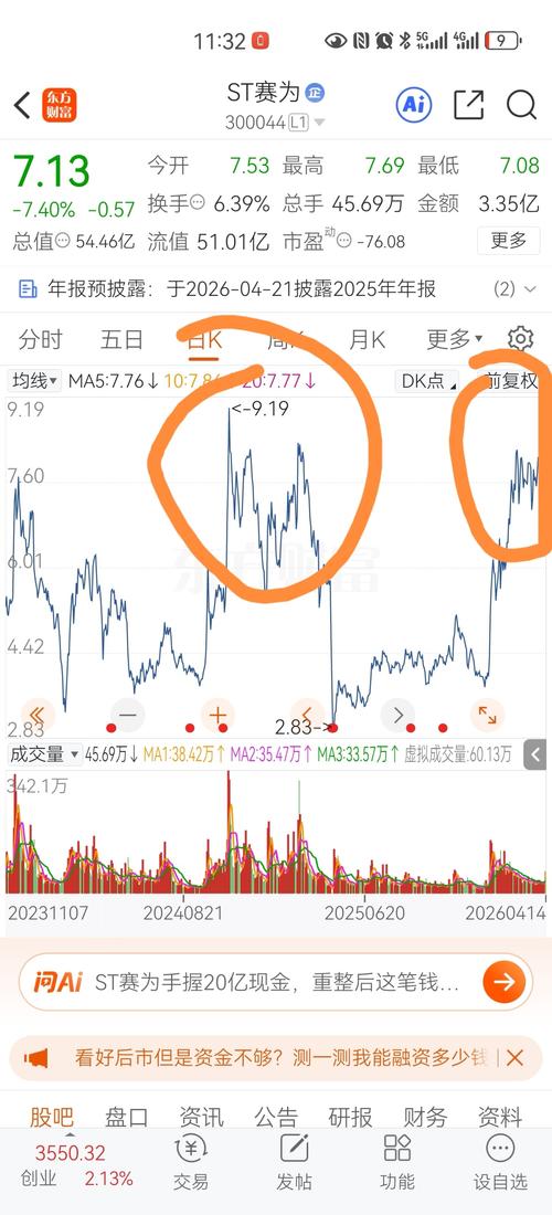 $ST赛为(SZ300044)$收盘价7.05