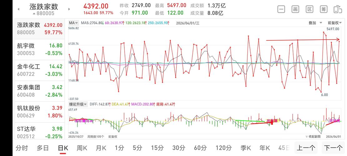 $上证指数(SH000001)$$航宇微(SZ300053)$$恒星科技(SZ002132)$ 复盘:两市成交额20125亿与昨天相比放量199亿,其中上证成交额8973亿与昨天相比放量54亿,说明下午放量上涨,收放量高开带上下引线的小阳K线!两市上涨4495家,下跌887家,涨停65家,跌停14家,平均股价涨0.69元赚钱效应不错!分时图来看:黄线在上,白线在下说明权重股搭台,题材股与小盘股补涨...