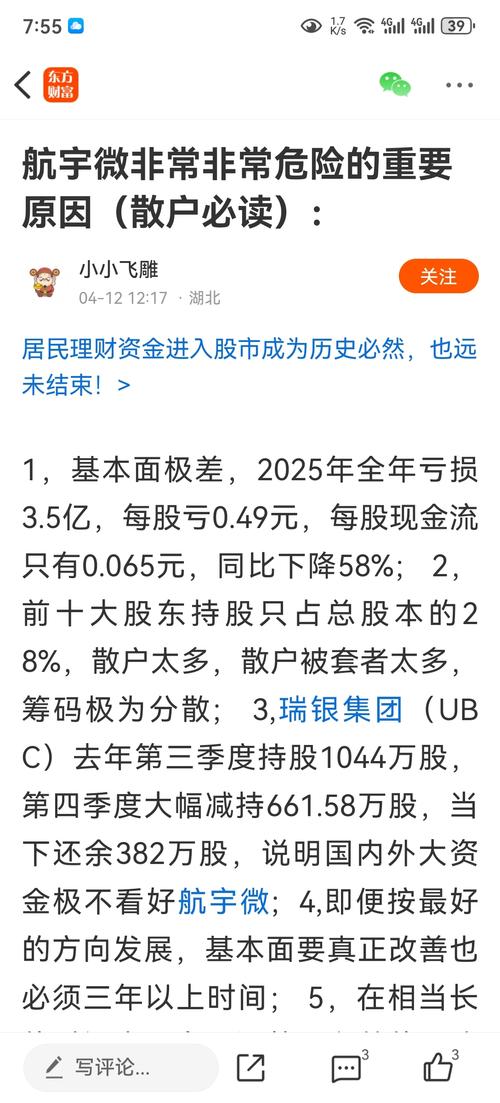 1,基本面极差,2025年全年亏损3.5亿,每股亏0.49元,每股现金流只有0.065元,同比下降58%;2,前十大股东持股只占总股本的28%,散户太多,散户被套者太多,筹码极为分散;3,瑞银集团(UBC)去年第三季度持股1044万股,第四季度大幅减持661.58万股,当下还余382万股,说明国内外大资金极不看好航宇微;4,即便按最好的方向发展,基本面要真正改善也必须三年以上时间;5,在相当长的时...