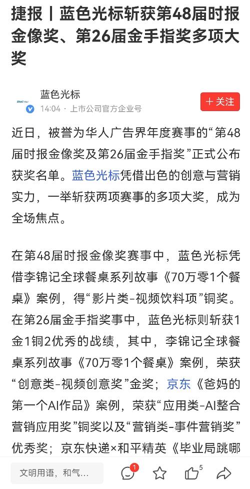 $蓝色光标(SZ300058)$回溯蓝色光标的发展,从十多年前的“营销智能化+业务全球化”战略主张,到如今的“AllinAI+全球化2.0”新战略,蓝色光标始终不变的,就是深刻于骨血中的“技术基因”,以及越来越坚定的技术和创新投入、越来越明确的业务布局。二十多年来,技术和产研也早已超越简单的支持部门角色,成为蓝色光标战略转型的核心驱动力。尤其在AI代际变革的浪潮中,技术不仅是蓝色光标构建核心竞争壁...