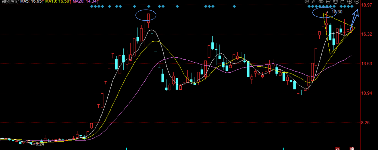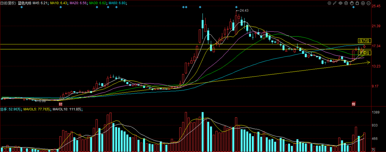 蓝色光标:$蓝色光标(SZ300058)$这一轮AI应用在下游大模型持续发布的推动下充分受益,尤其是当前的AI营销更是市场热点。相关个股在底部形成涨停板触底反弹走势后,沿着震荡中枢整理形态回踩五天均线,随后沿趋势向上运行。昨日走势恰好触及上一轮调整的下压均线,形成了下方有支撑、上方受均线压制的技术形态。目前来看,个股呈现上涨放量、调整缩量的结构特征;作为弹性标的,其整体调整幅度相对较小,上涨幅度却...