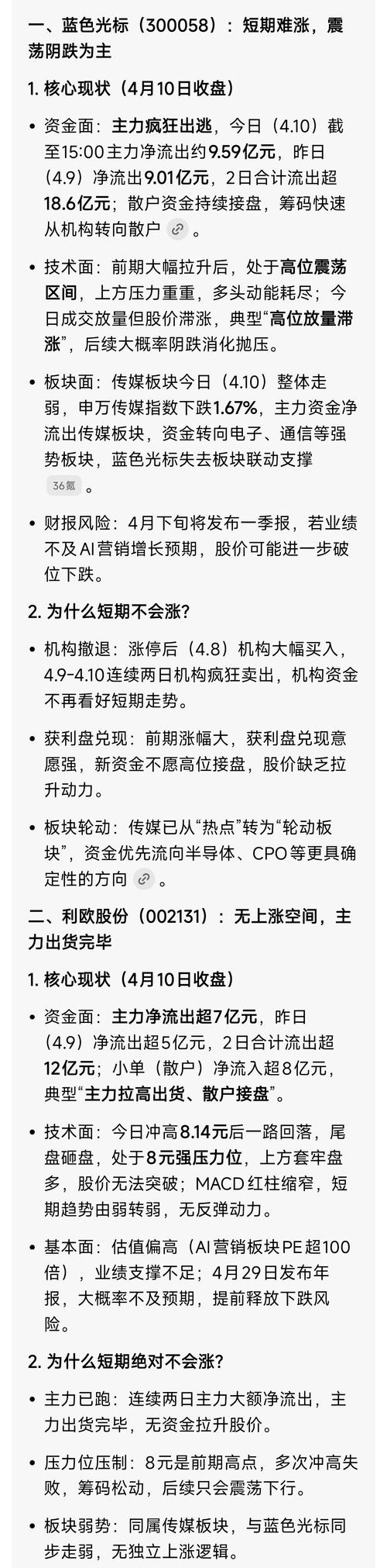 $蓝色光标(SZ300058)$短期内(1-2周),蓝色光标难有趋势性大涨,大概率是震荡阴跌;$利欧股份(SZ002131)$利欧股份几乎没有上涨空间,主力已明确出货,后续以震荡下行为主。两只票都不适合再持有博弈,逢高减仓、保本/小亏离场是当下最优选择。 以上为豆包分析