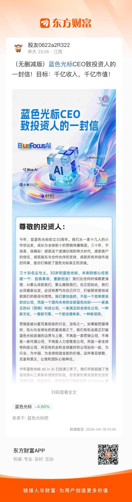 (无删减版)蓝色光标CEO致投资人的一封信!目标:千亿收入,千亿市值!