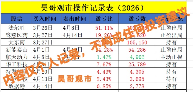 $沪电股份(SZ002463)$今日持仓布局:老仓稳守,新仓出击 $舒泰神(SZ300204)$:当前浮盈超40%,作为本轮收益的核心标的,继续持有,博弈后续行情空间。 宁德时代和德明利也继续持有中 新介入美诺华,精准捕捉早盘异动机会,完成全新赛道的布局,为账户增添新的盈利增长点 声明:仅为个人投资记录,不构成任何投资建议!$蓝色光标(SZ300058)$