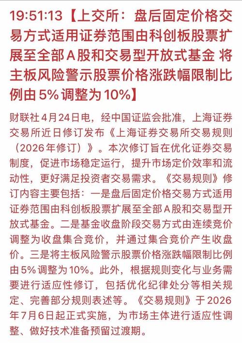 4月24日,经证监会批准,上交所正式发布2026年修订版交易规则,7月6日起全面实施!这是A股交易制度的一次关键升级,直指市场痛点,优化定价效率、激活流动性,更贴合投资者需求,中长期将重塑市场生态,释放巨大红利! 一、三大核心修订,直击市场痛点 1.盘后定价交易全覆盖,资金入市更灵活 盘后固定价格交易从科创板扩展至全部A股+ETF!简单说,收盘后仍能按收盘价买卖,方便大资金、中长期资金精准布局,减...